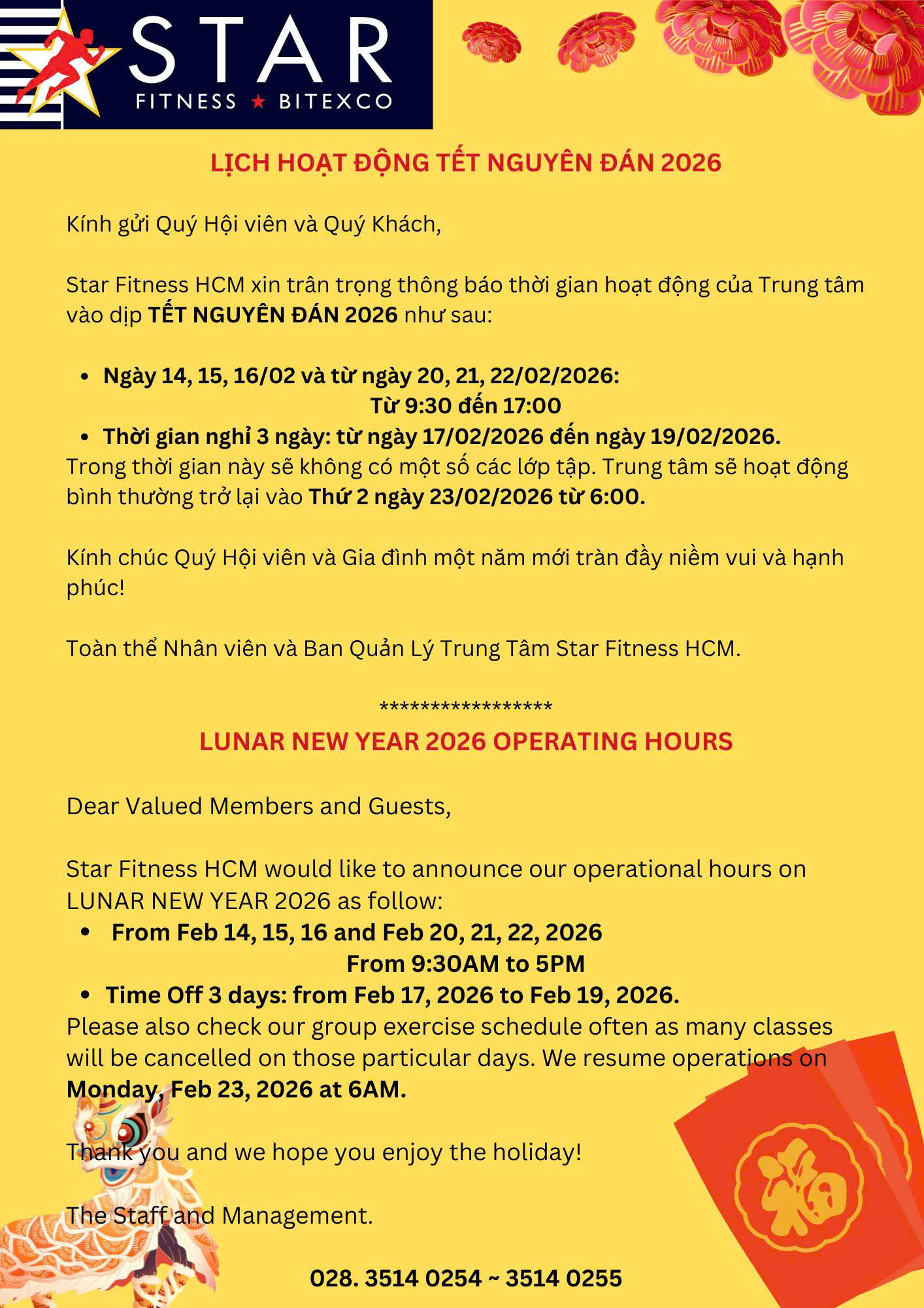 LỊCH HOẠT ĐỘNG TẾT NGUYÊN ĐÁN 2026 - Star Fitness HCM